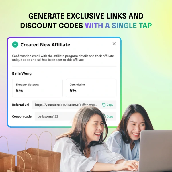 Affiliates bring in fresh, untapped traffic: Your affiliate partners (KOLs, brand friends, etc.) have audiences you can’t reach on your own. When they share their exclusive Boutir-generated link or discount code, they introduce your store to hundreds (or thousands) of potential new customers, people who already trust their recommendations (so they’re more likely to click through).