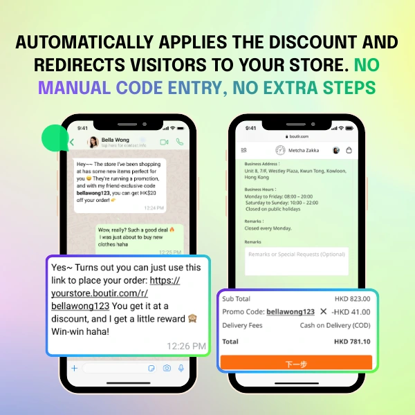 Faster conversions, less friction: When visitors click a partner’s link or a customer’s referral code, Boutir automatically applies the discount and redirects them to your store. No manual code entry, no extra steps, this shortens the shopping path and boosts conversion rates significantly.