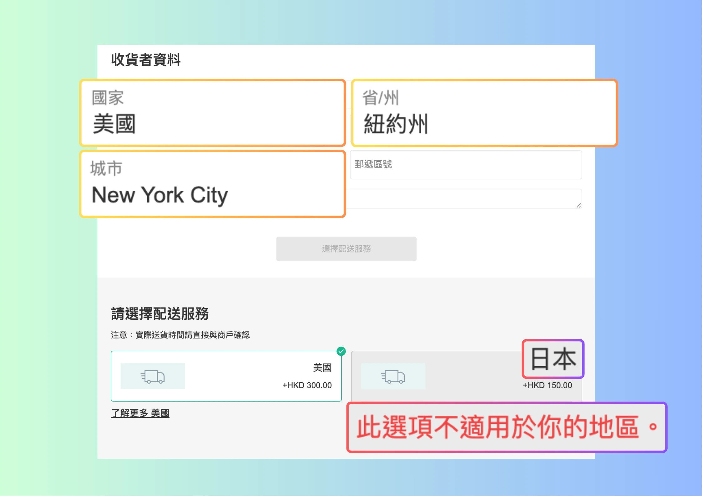 設定物流選項的覆蓋範圍,結帳時自動篩選合適的選項,避免顧客誤選而造成訂單處理延誤。