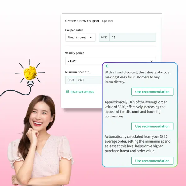 Boutir Advantage: BoostAI analyzes your average order value (AOV) and suggests optimal minimum thresholds and discounts to maximize profit. For example, if your AOV is $120, it might recommend a “$30 off $180+” coupon to push customers to add more items.