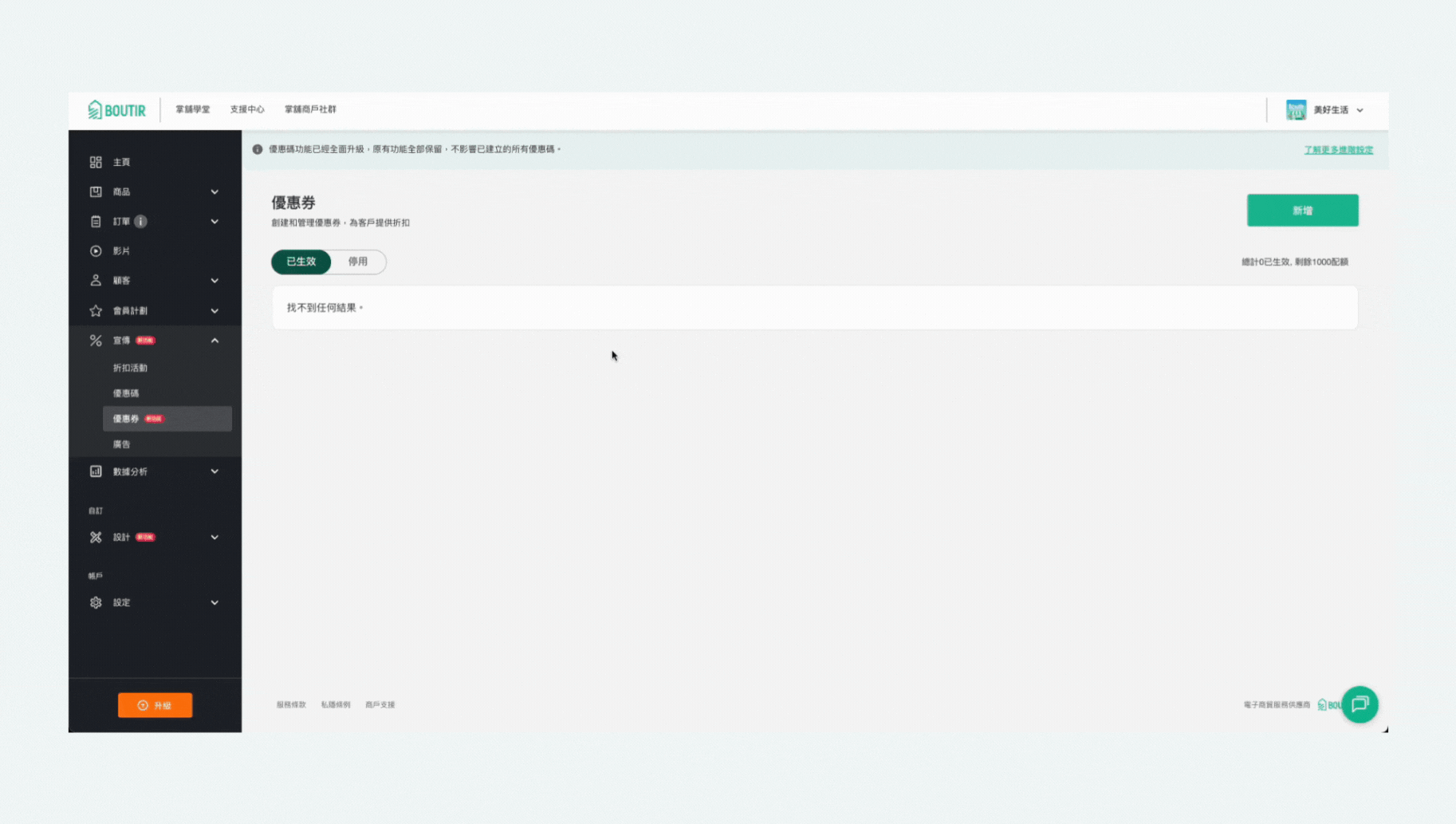 - 登錄 Boutir 管理介面,點擊「宣傳」中的「優惠碼」。