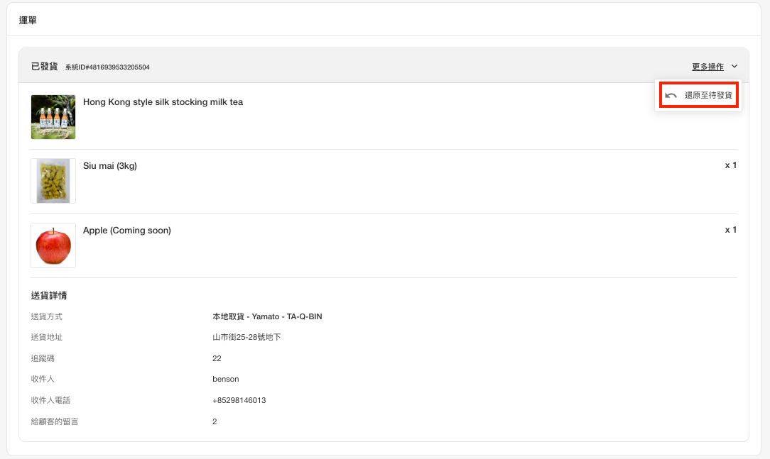 訂單如錯誤地「標記為完成」/ 「確認發貨」,可以使用此功能還原到未完成前的狀態。