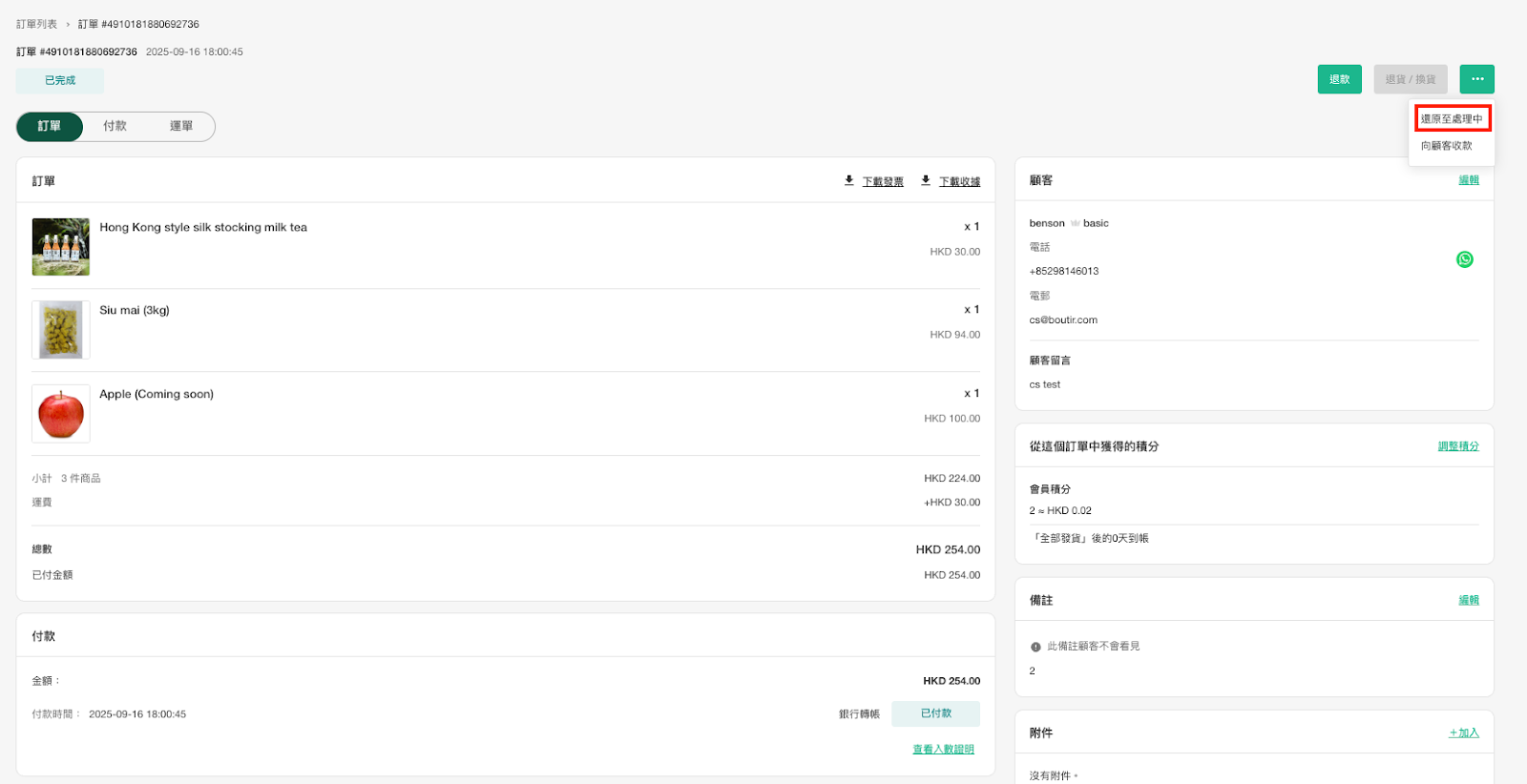 - 訂單還原後,會員積分將會自動收回,直到重新完成訂單後根據最後的價值重新派發積分。