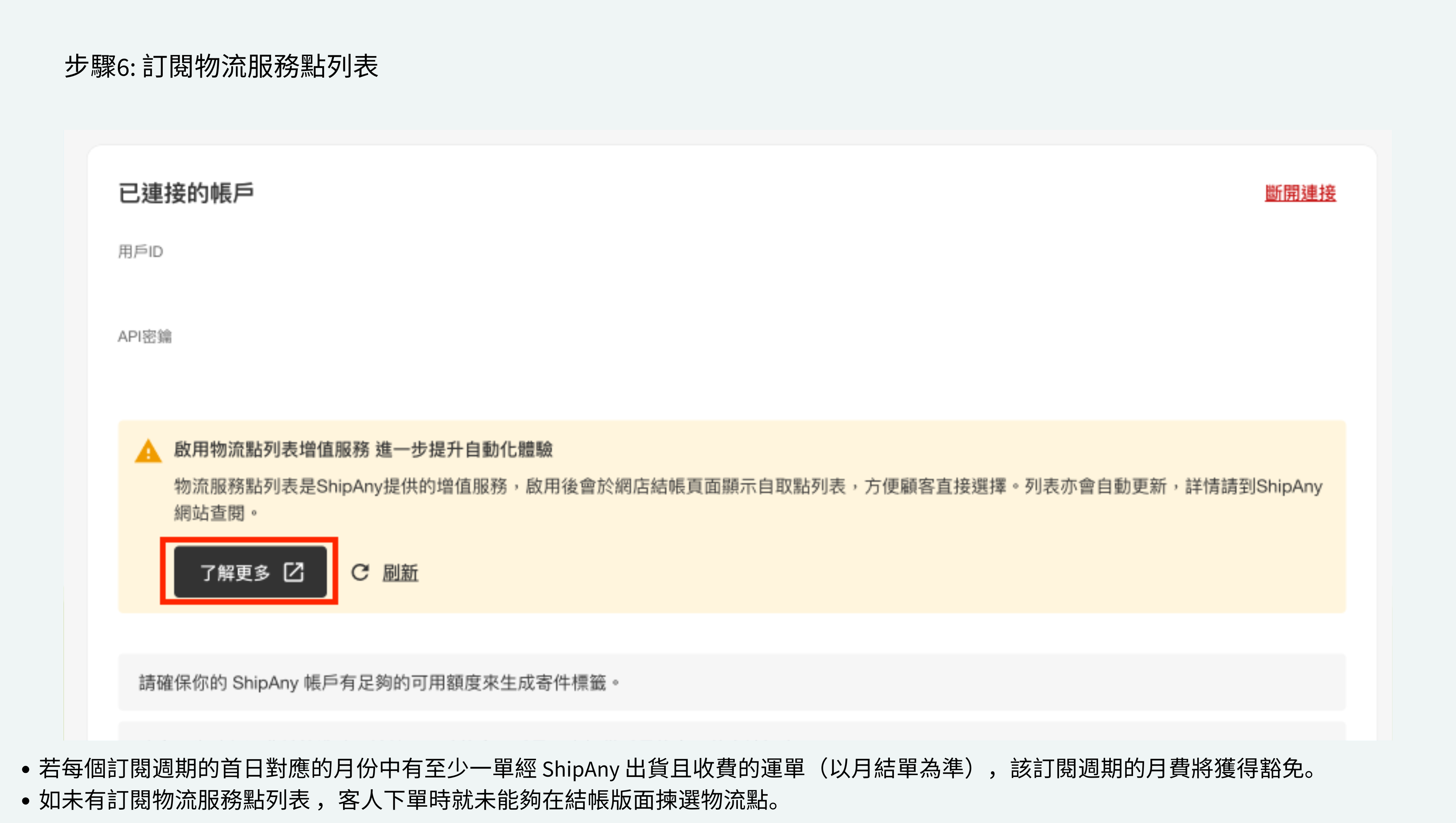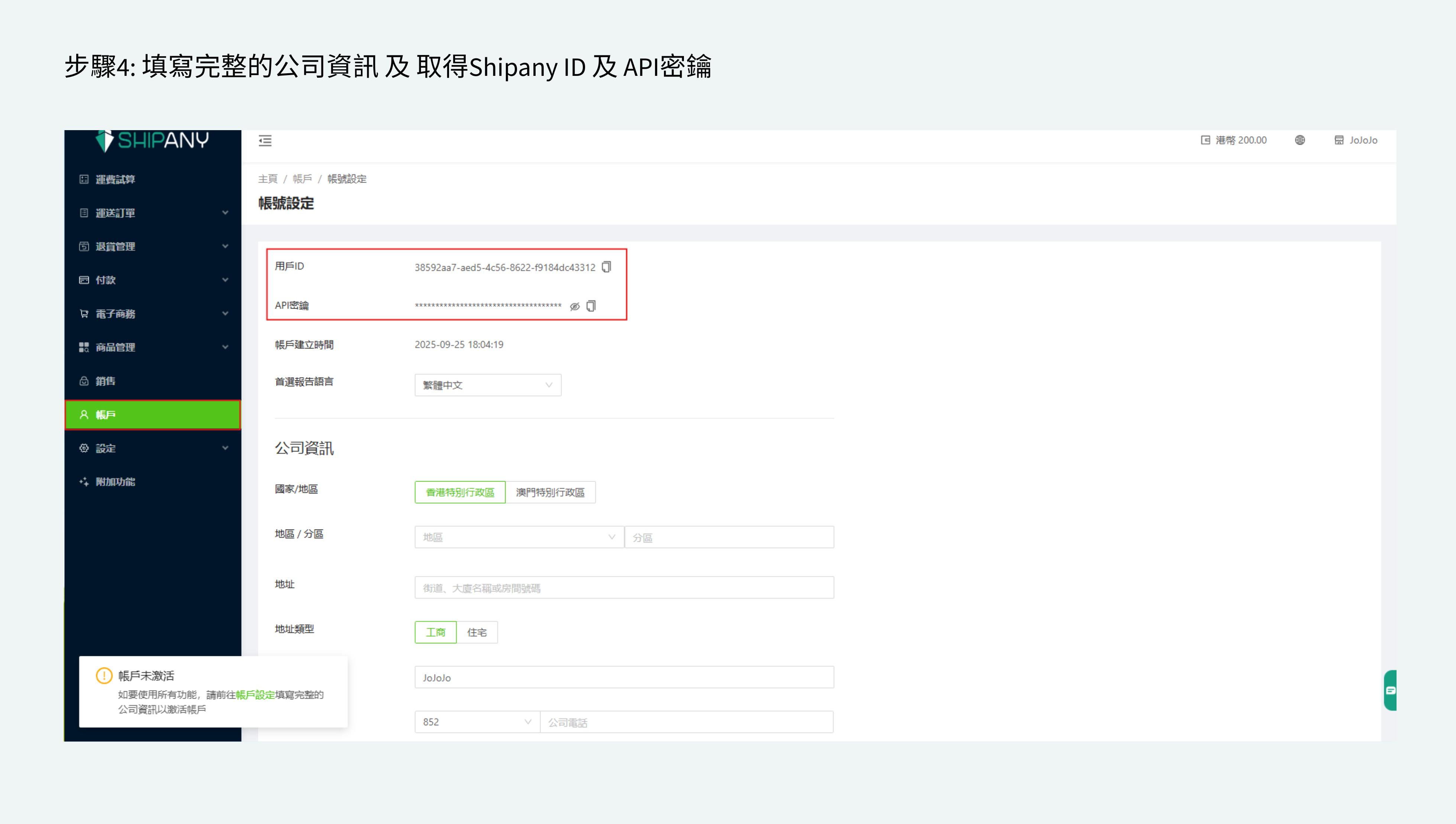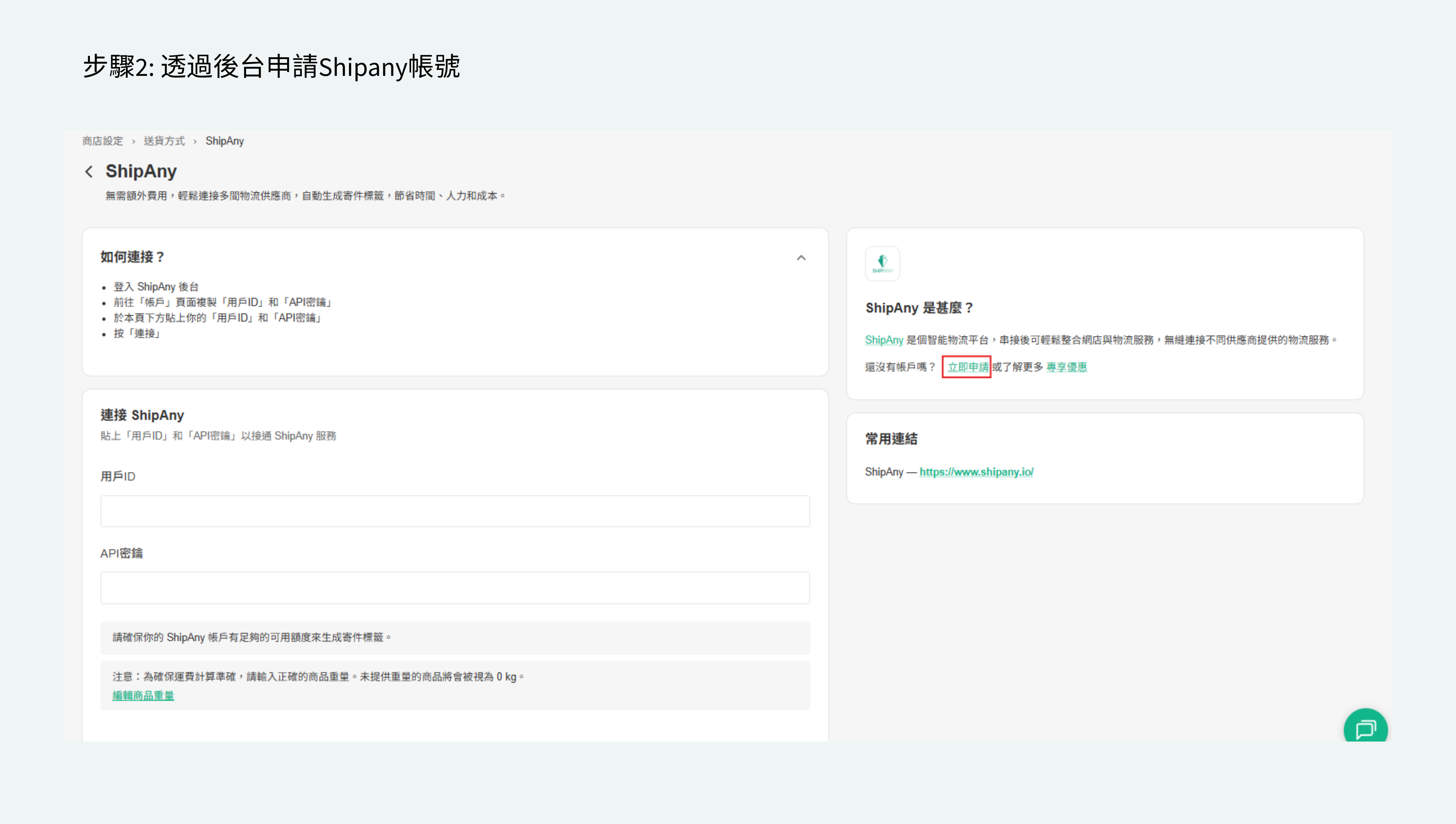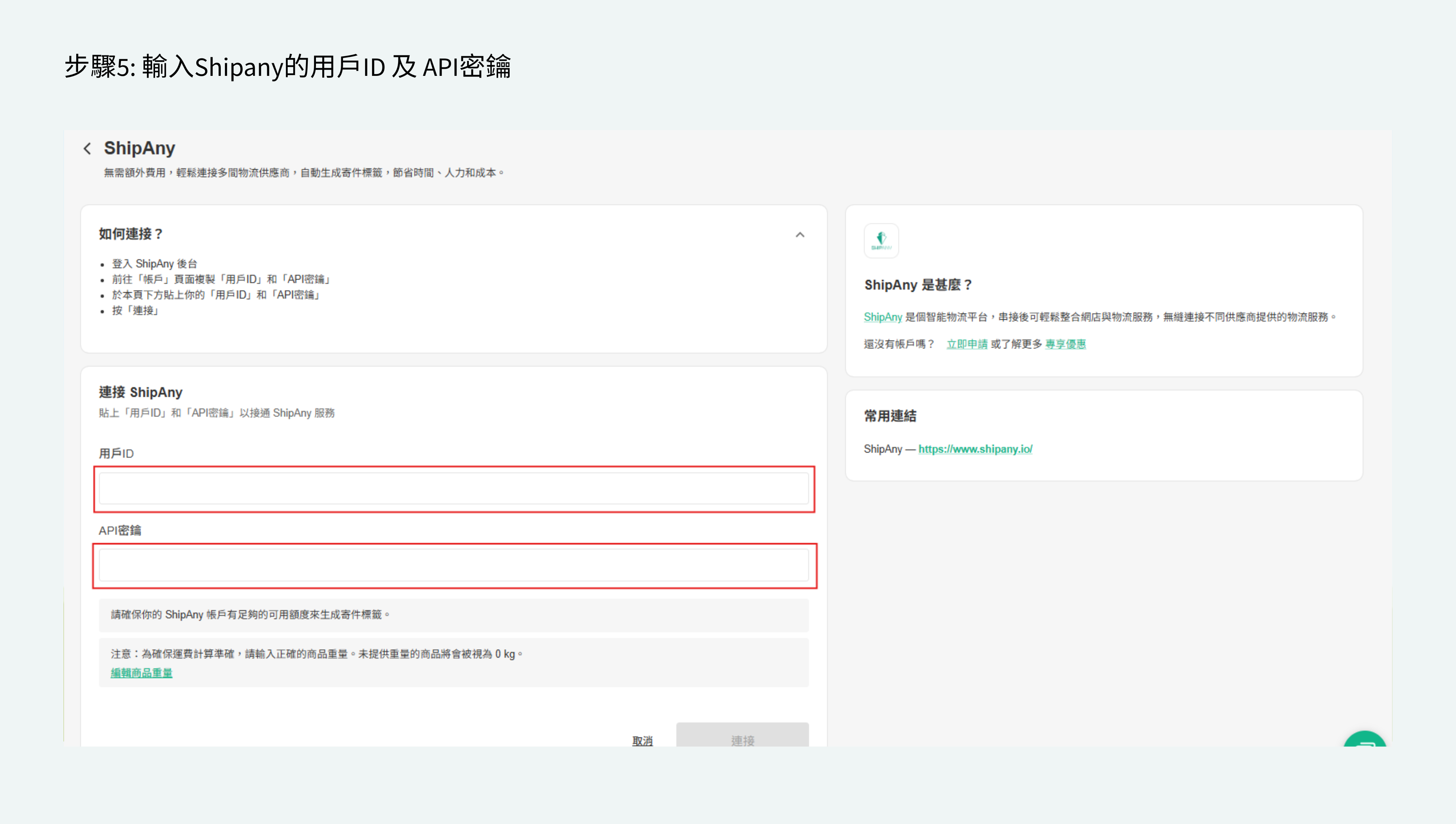 - 輸入你的ShipAny 用戶ID 和 API 密鑰。