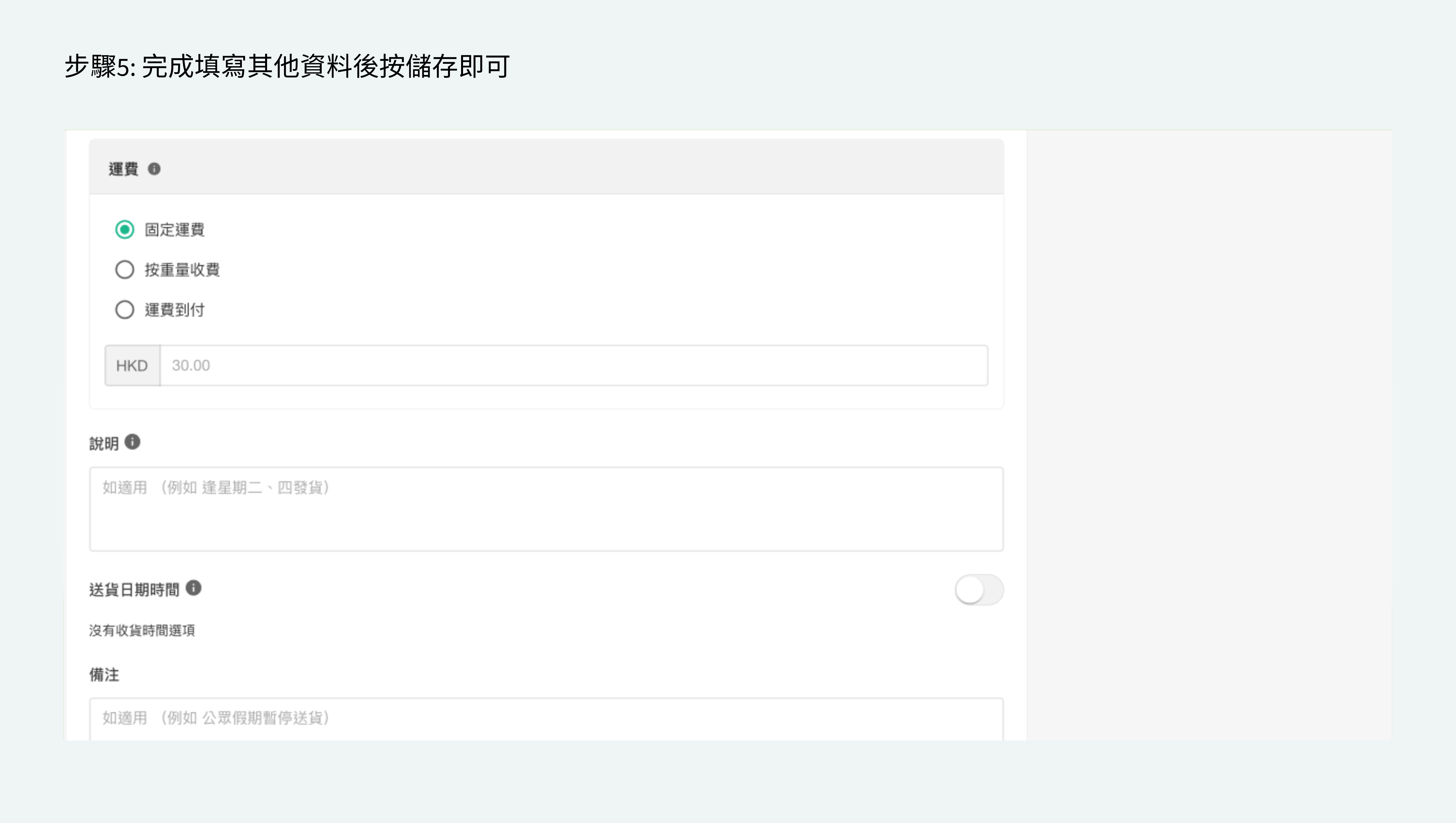 - 填寫:物流方式名稱 (會顯示在結賬頁面)