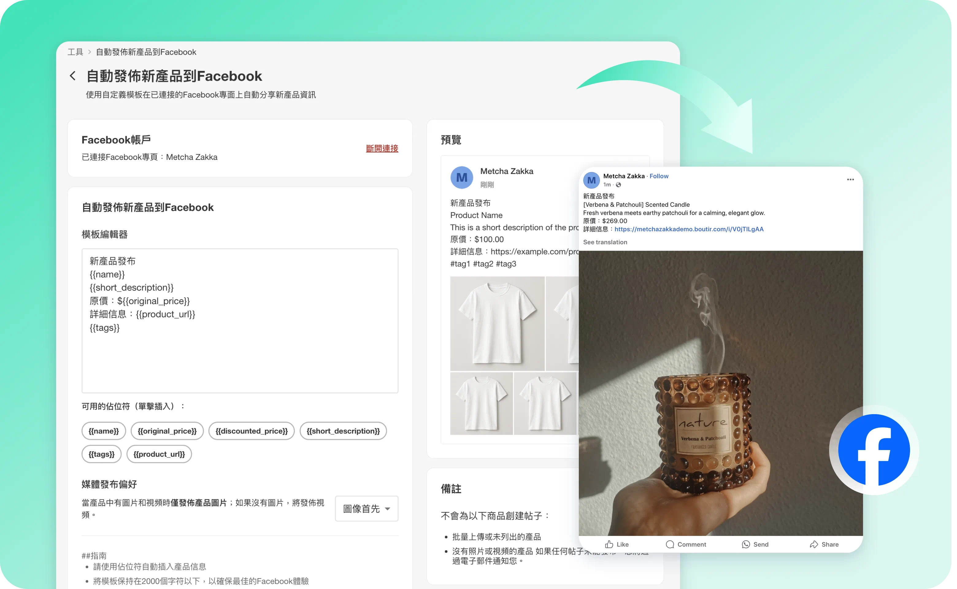 商户现可于掌铺网页版设定「商品发布同步至Facebook」功能,每当新增商品时,系统将自动生成帖文并发布至专页,节省手动操作时间。此功能助你即时推广新品及优惠,扩大宣传覆盖范围,吸引更多顾客关注。