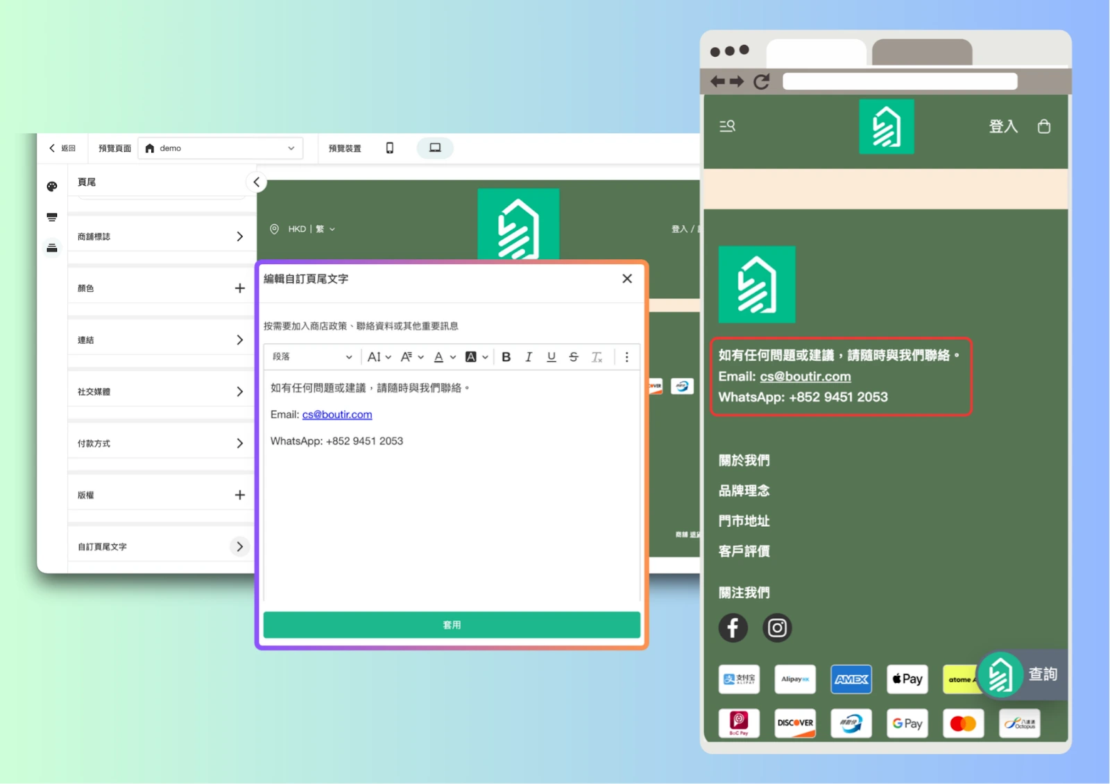 為配合商戶不同需要,頁尾增設自訂文字方塊,方便展示商店政策、聯絡資料或其他重要訊息。